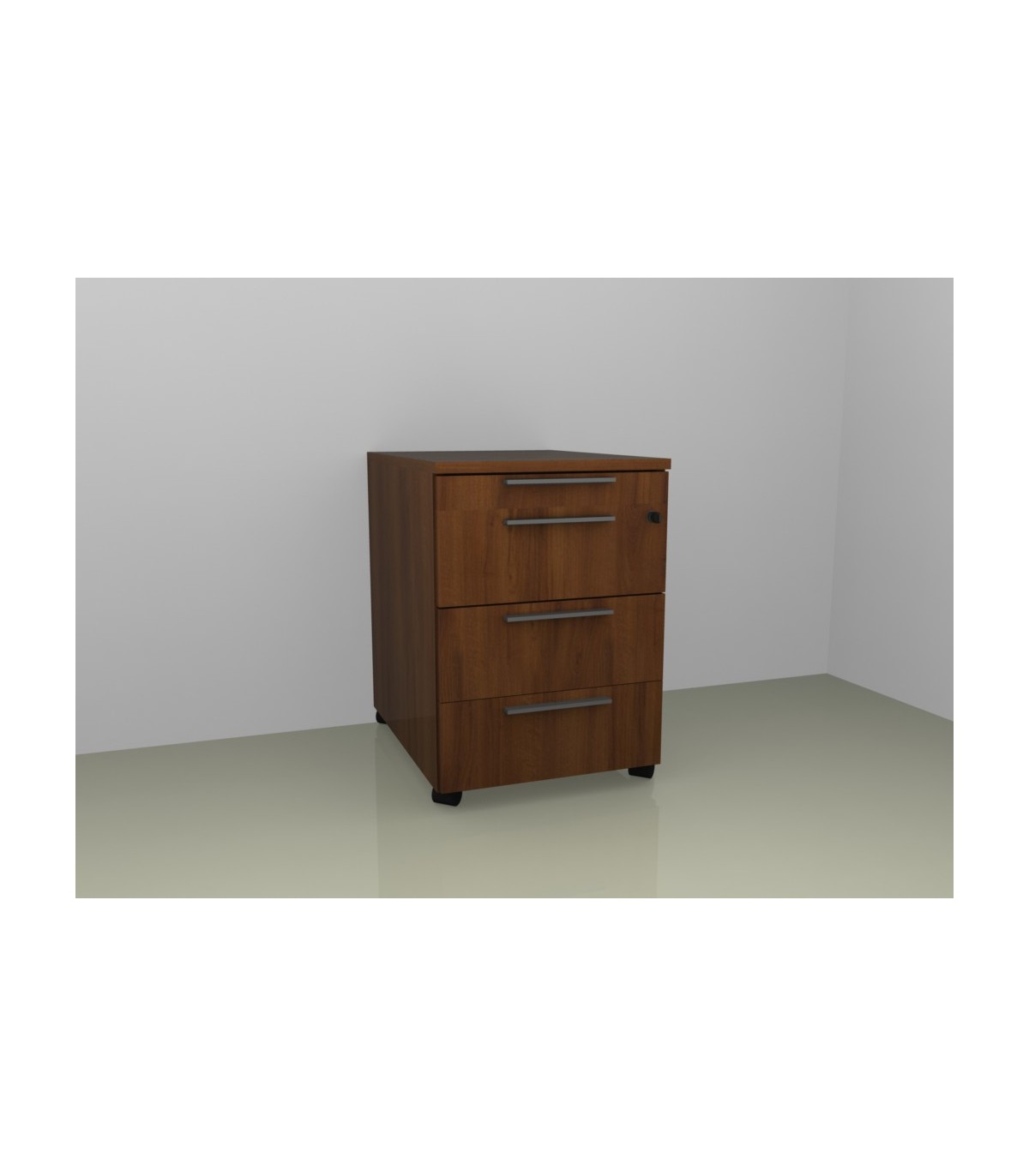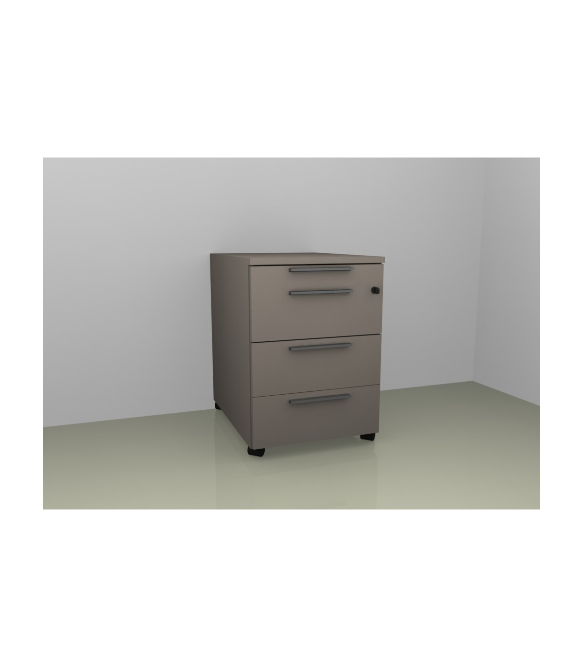 Cassettiera in legno su ruote, realizzata in pannelli di legno truciolare sp. 18 mm. rivestiti in carta melaminica, a bassa emissione di formaldeide E1 e bordo perimetrale in ABS in tinta sp. 0,8 mm.