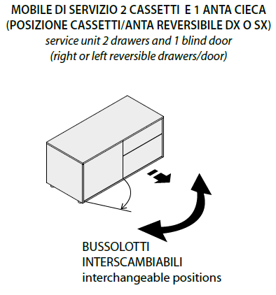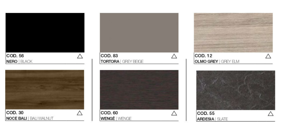 Schiena, ante, top e fianchi finali sono realizzati con pannelli di fibre di legno tipo MDF sp. mm 18 con il lato interno nobilitato e e parti a vista rivestite in 3d-foil nei colori: OLMO GREY 12, NOCE BALI 30, ARDESIA 55, NERO 56, WENGÈ 60, TORTORA 83.