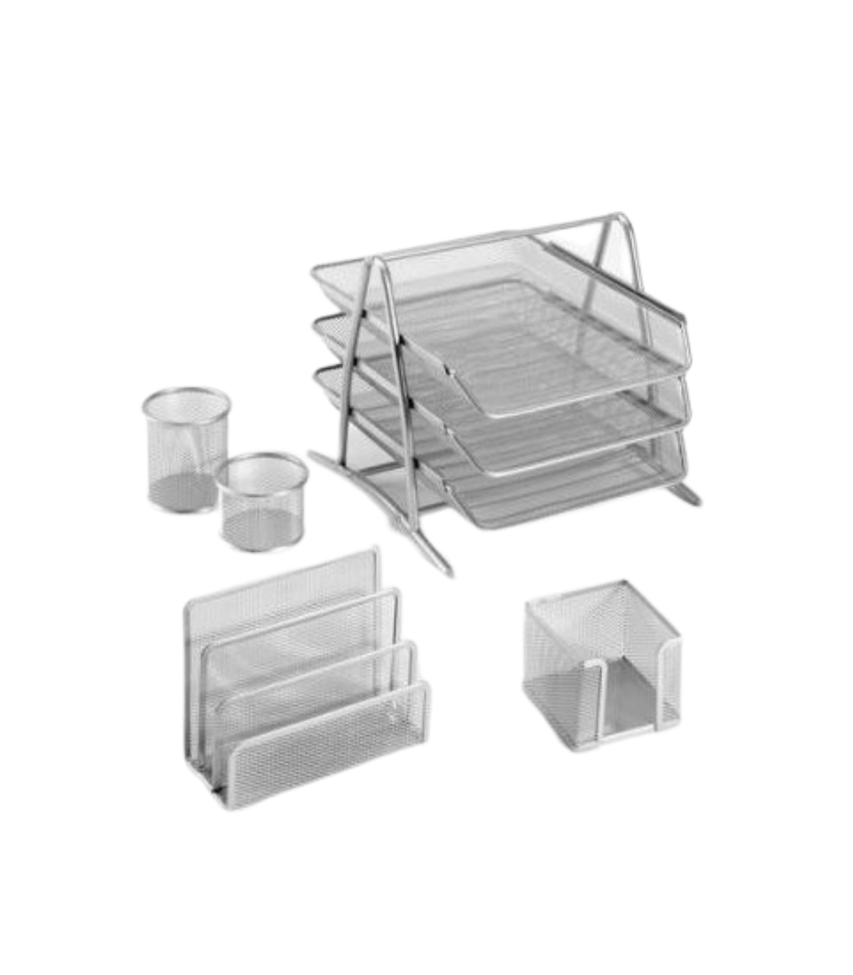 Set da scrivania in metallo traforato. Composto da portalettere, portacorrispondenza, portapenne, porta graffette, porta foglietti.