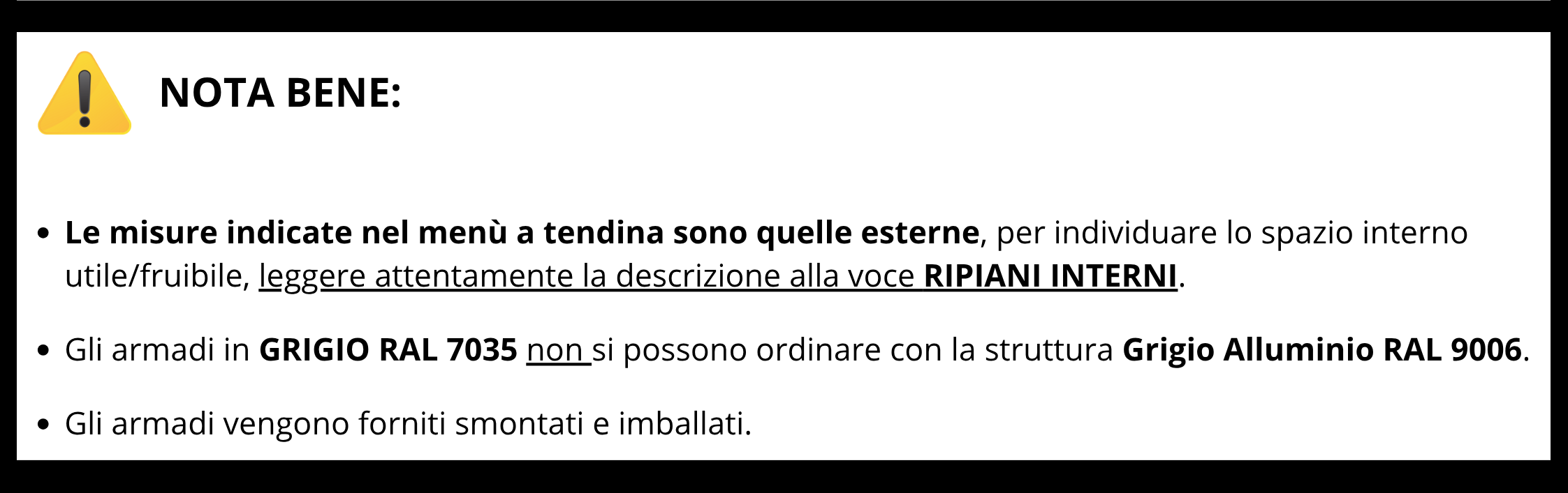 LE VARIANTI COLORATE HANNO LA STRUTTURA GRIGIO RAL 9006 OPPURE POSSONO ESSERE NELLO STESSO COLORE DELLE ANTE SENZA ALCUNA VARIAZIONE DI PREZZO.