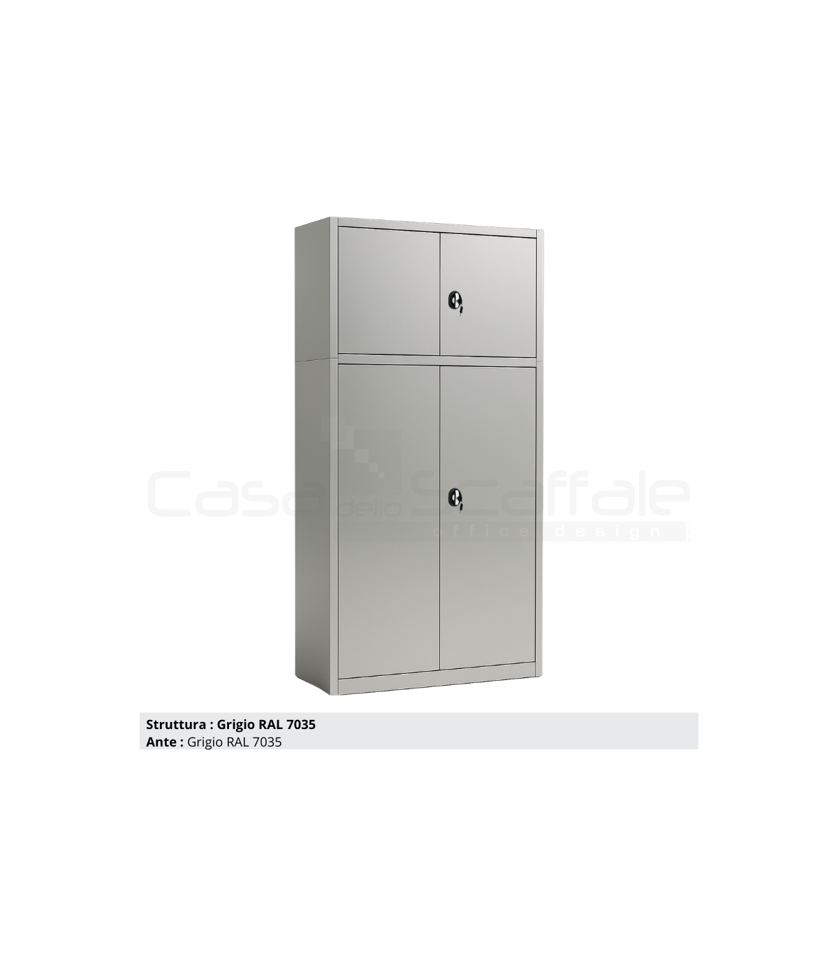 Armadio metallico ad ante battenti abbinato al sopralzo, provvisti entrambi di serratura.