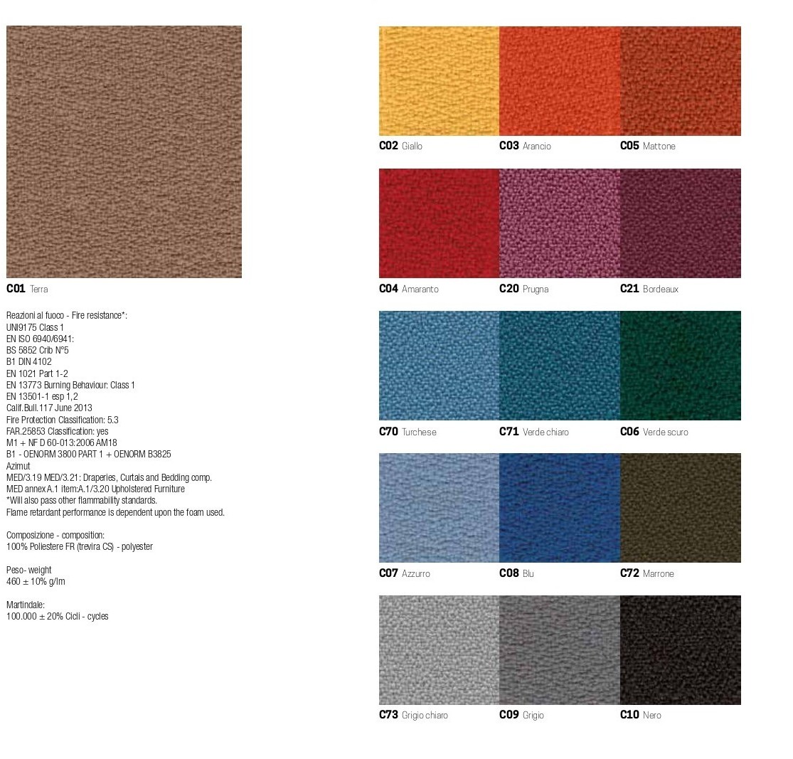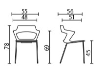 Schienale/Sedile: Monoscocca in plastica, polipropilene (PP) disponibile in 8 colori a catalogo bianco, senape, tortora, rosso, verde, blu, grigio e nero.