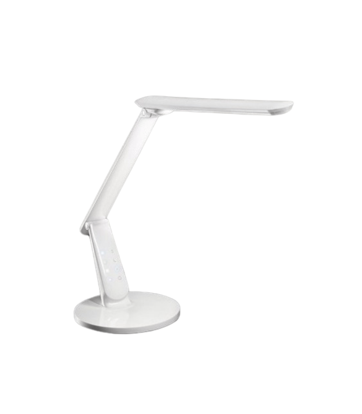 Lampada da tavolo in plastica colore bianco con porta Usb per ricaricare lo smartphone.