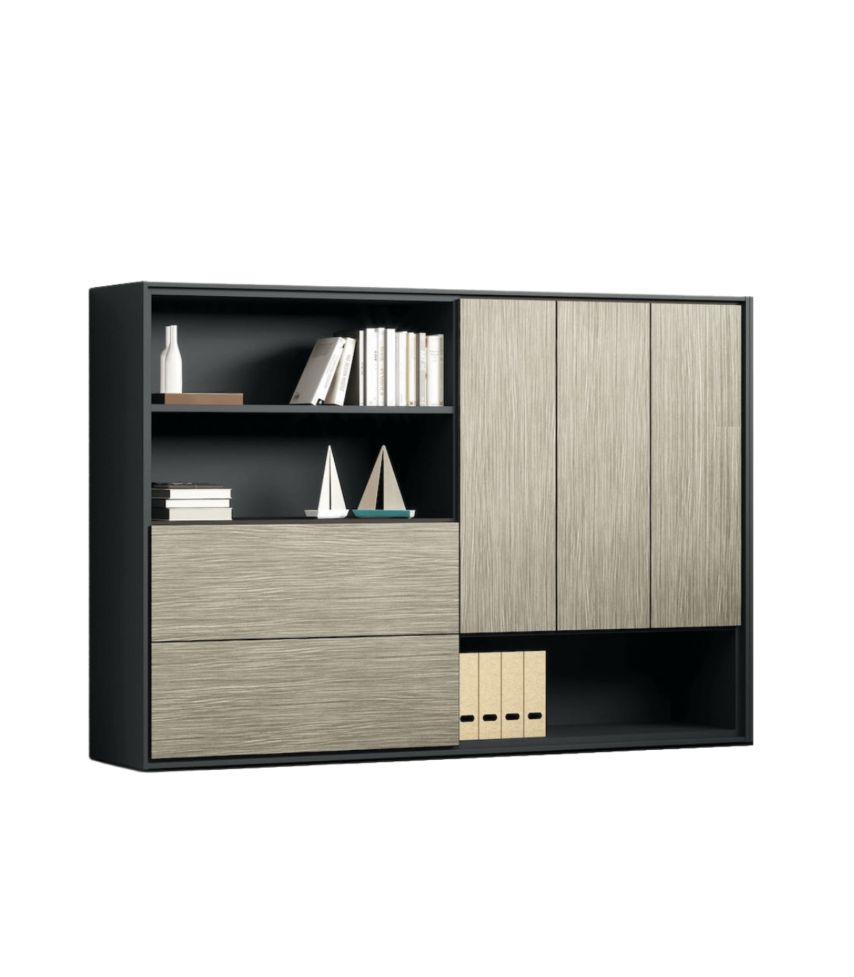 1- Melaminico: realizzati con pannelli di particelle di legno di spessore mm 18 nobilitati melaminico, rifiniti perimetralmente con bordo in ABS spessore mm 2 in tinta con la superficie. Disponibili nei colori: PIOPPO MORO 63 , PIOPPO LIGHT 64.