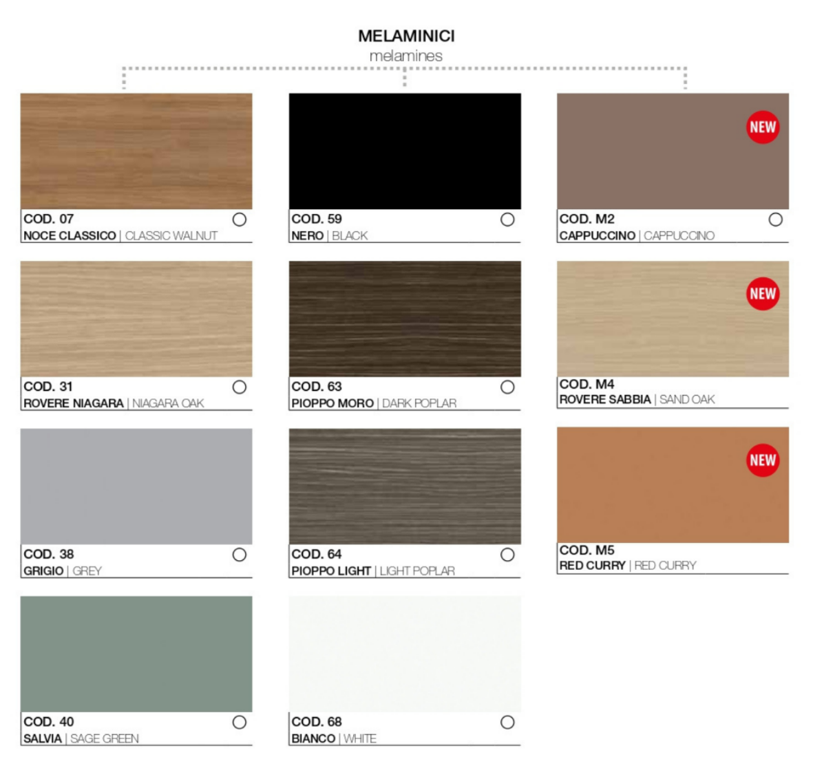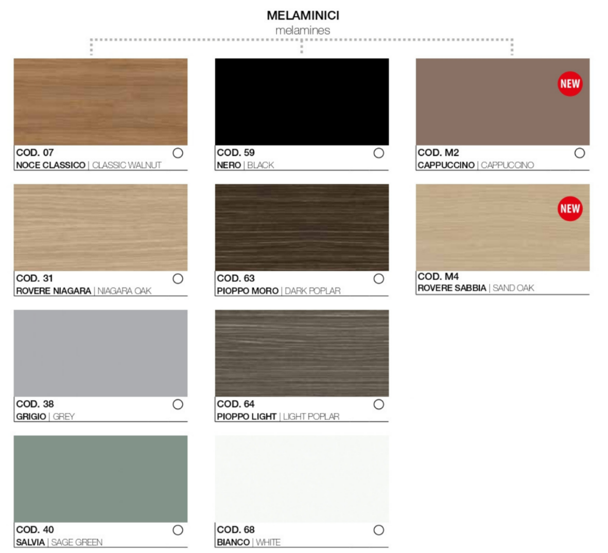 Realizzati con cornice formata da base, cappello, fianchi e schiena in spessore mm.18. Pannelli di fibre di legno nobilitati in melaminico e bordati perimetralmente in ABS mm. 0,45 in tinta con la superficie