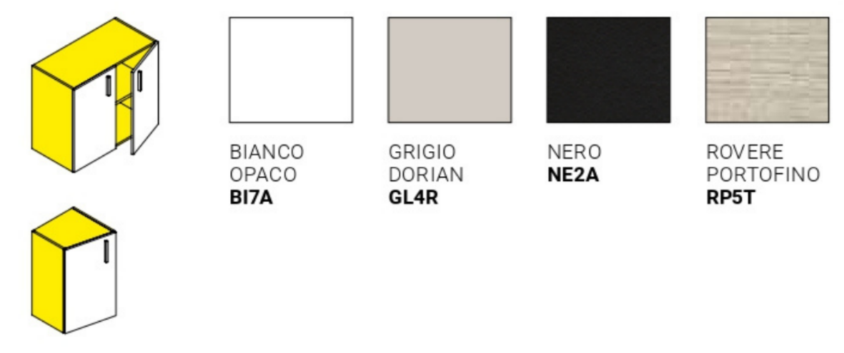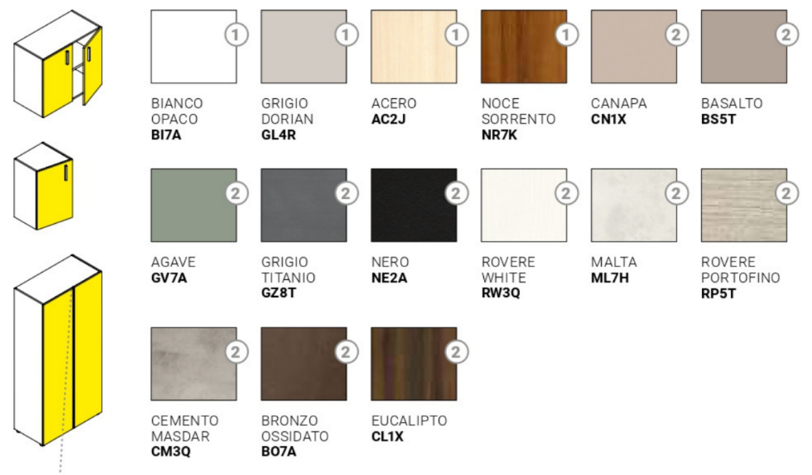 Le facciate sono realizzate in pannello di legno truciolare sp. 18 mm rivestito in carta melaminica sp. 18 mm. a bassa emissione di formaldeide E1, finitura in cera e bordo perimetrale in ABS in tinta sp. 0,8 mm dotate di cerniere in metallo trattato anti-corrosione di facile montaggio, con chiusura a molla, apertura a 110° e regolazione in 3 direzioni.