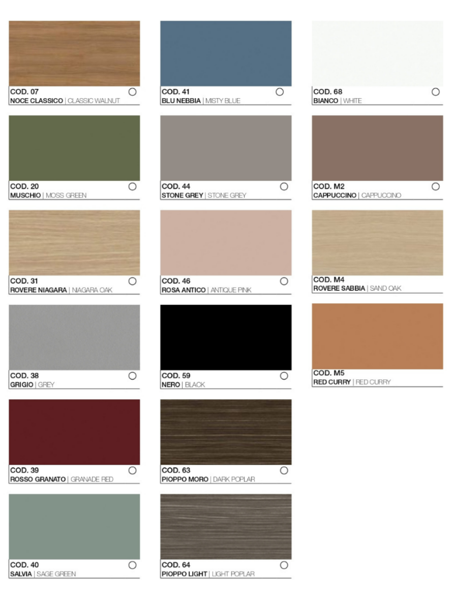 Finiture frontali : Noce classico, Muschio, , Rovere Niagara, Grigio, Rosso Granato, Salvia, Blu Nebbia, Rosa Antico, Nero, Pioppo Moro, Pioppo Light, Bianco, , Stone Grey, Cappuccino, Rovere Sabbia , Red curry.