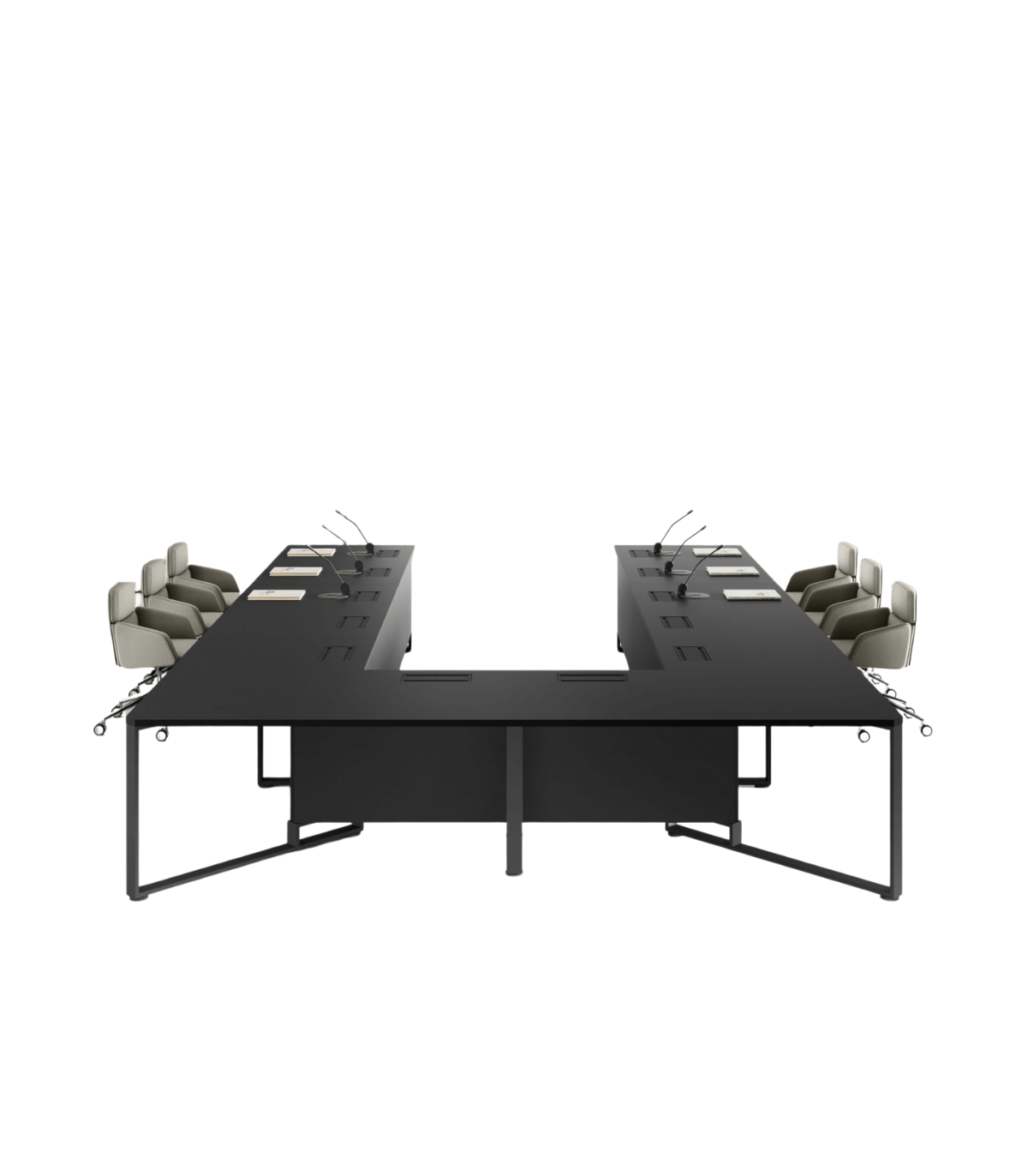 Le gambe terminali e centrali , sono combinabili fra loro e consentono l’aggregazione di vari moduli idonei a configurare molteplici tipologie di tavoli di forma quadrata o rettangolare che ne consentono l’ utilizzo in sale di piccola e media riunione così come per grandi sale consigliari.