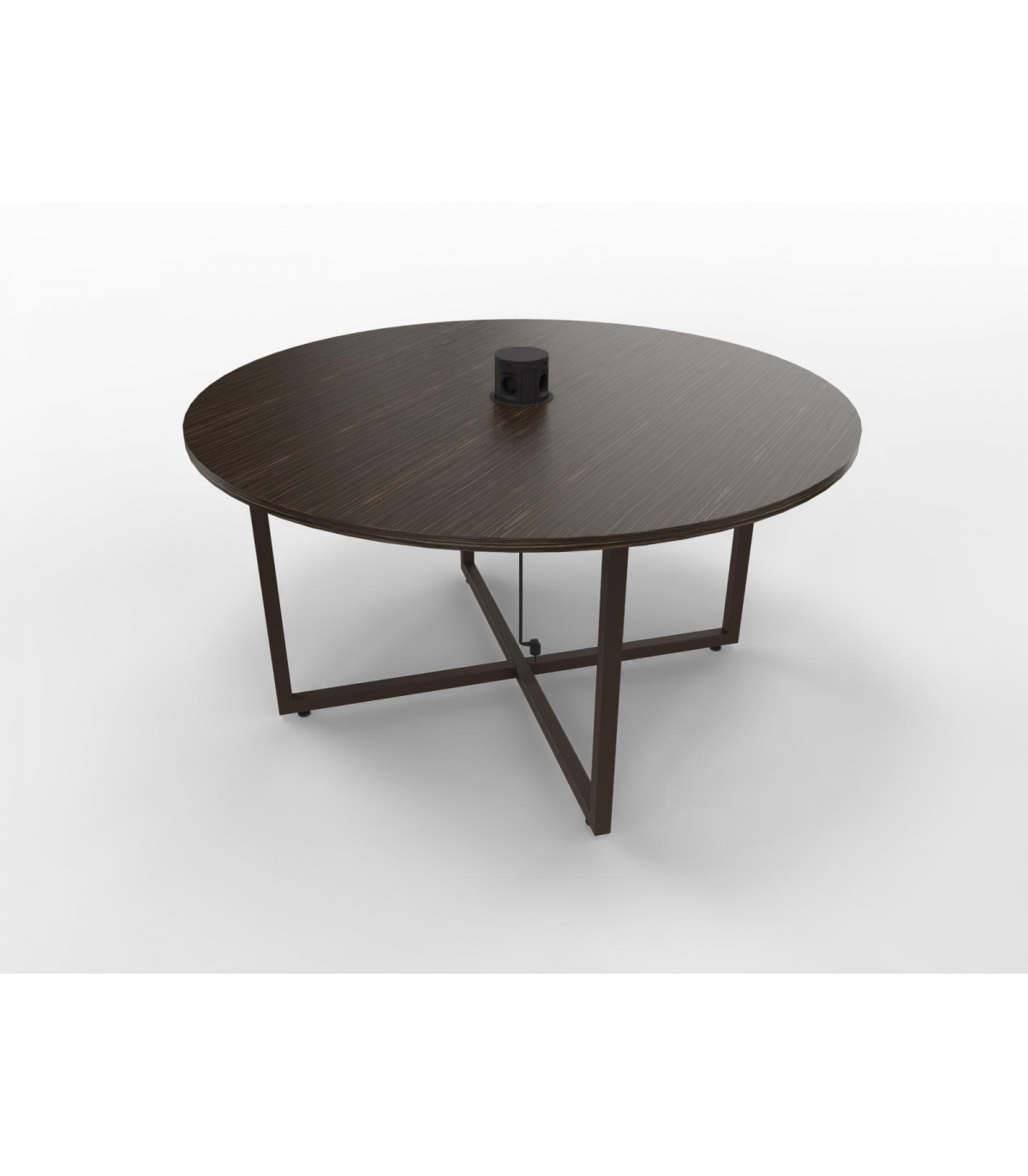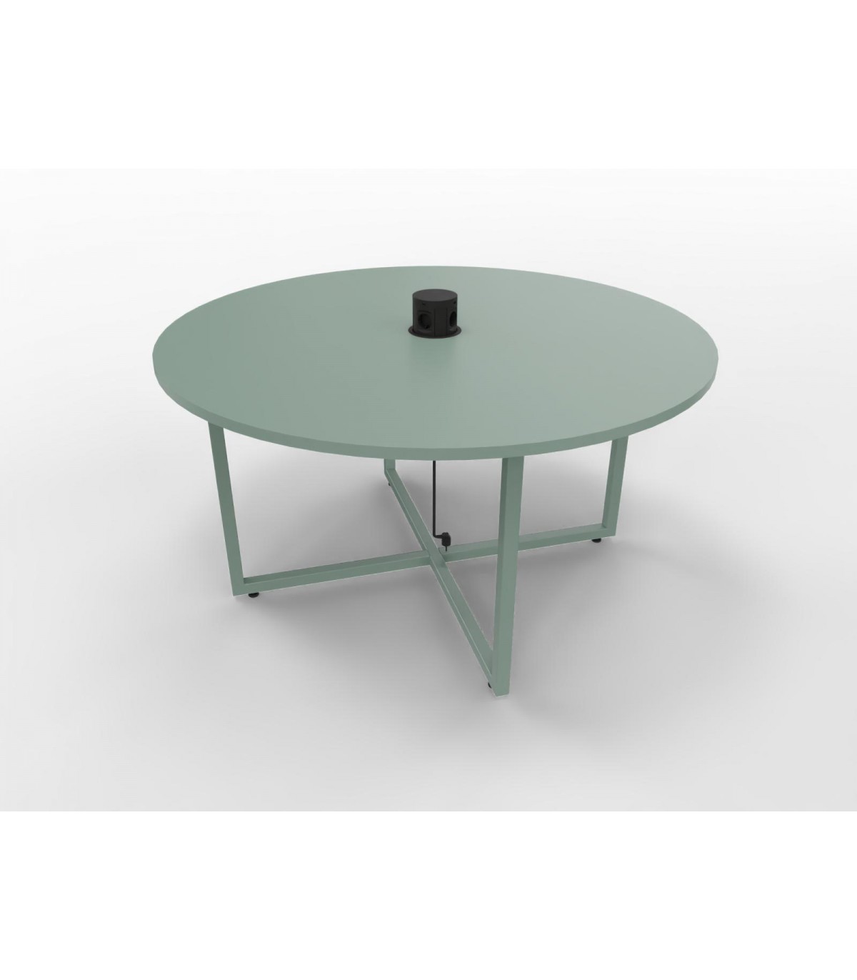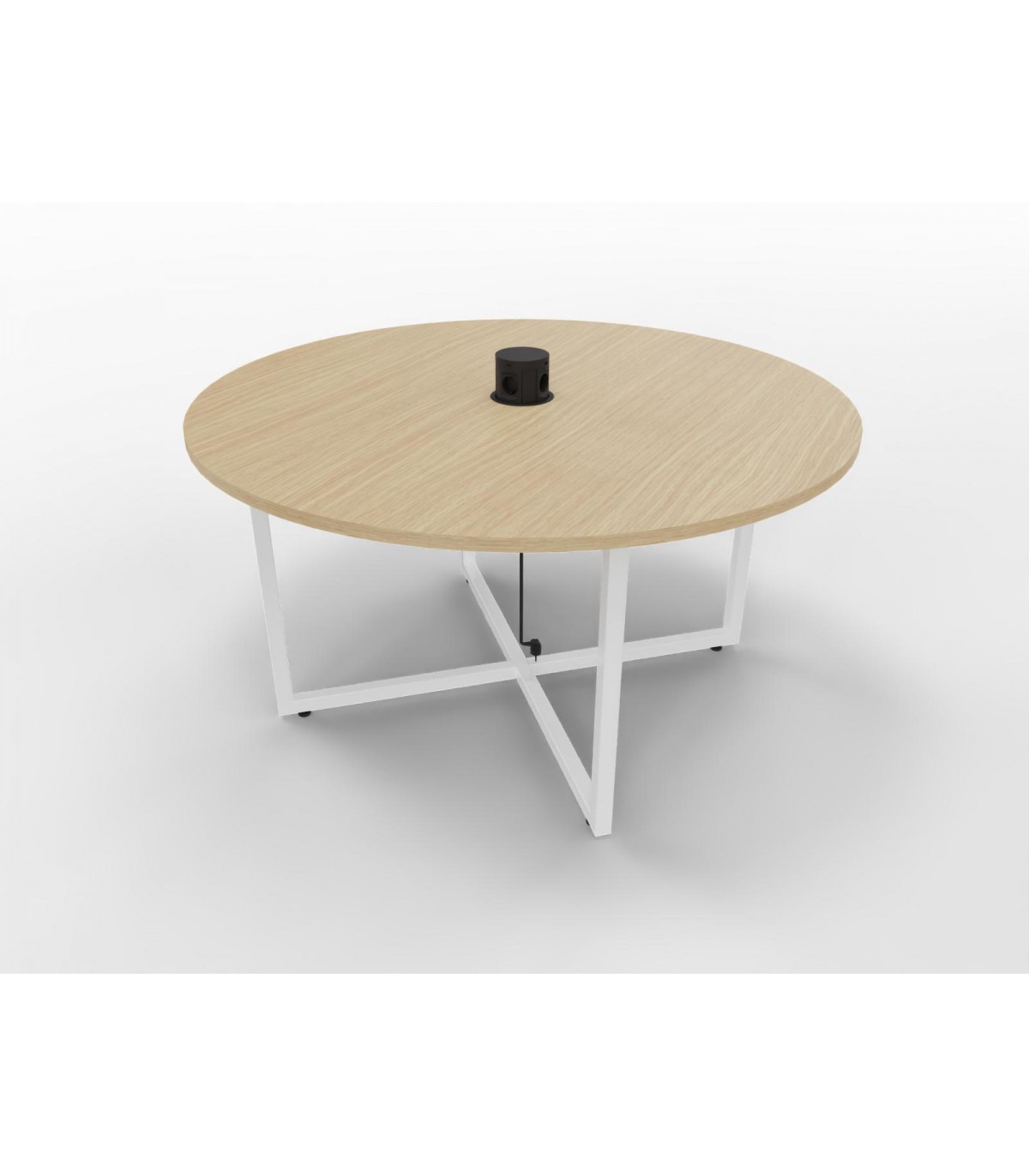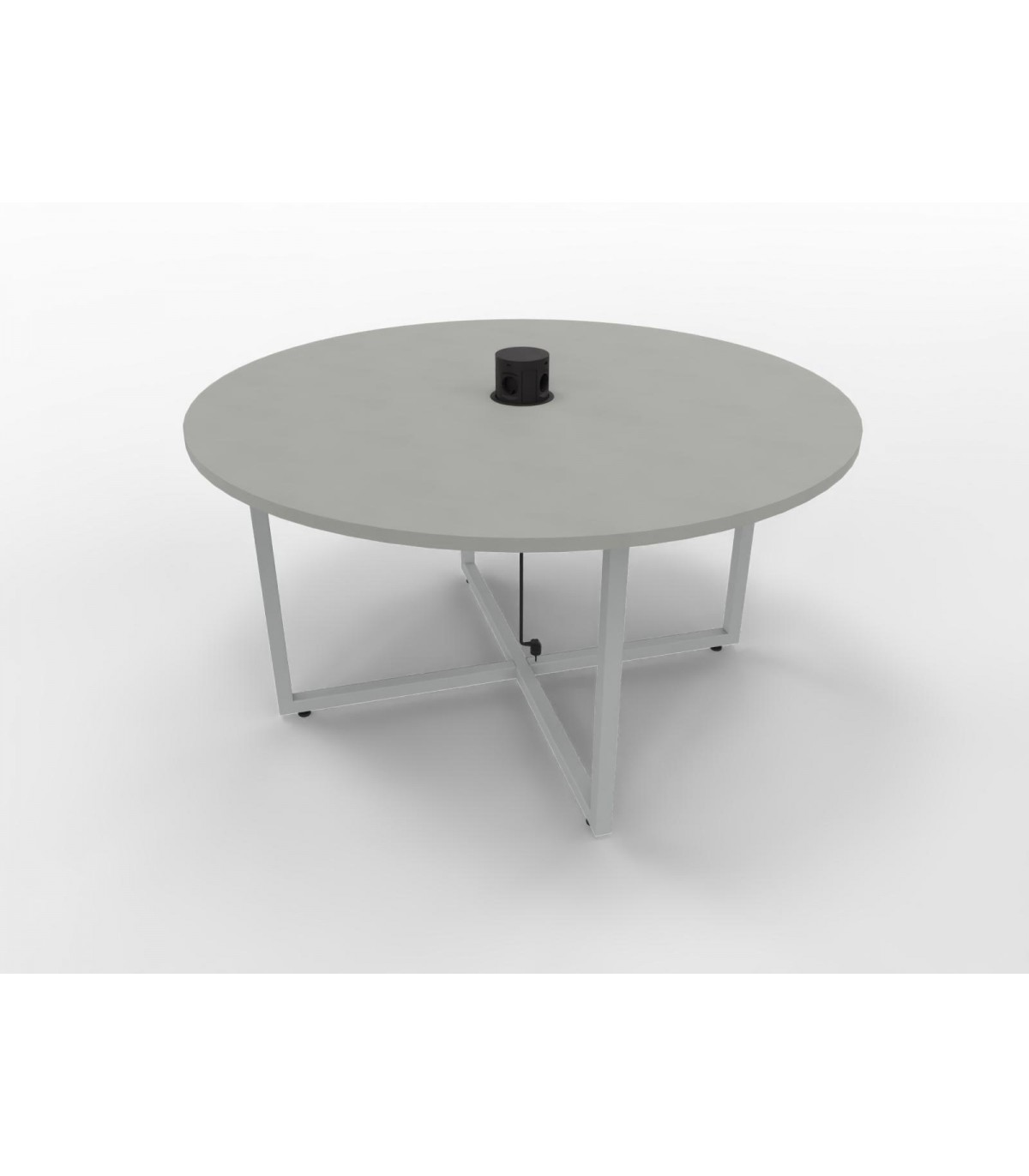 Basamento in tubolare metallico formato da due “anelli” a incastro di sezione mm. 35x35x3. Nei traversi inferiori vengono avvitati piedini registrabili in altezza. I piani possono essere semplici o con foro per elettrificazione. L’elettrificazione, da scegliere a parte per colore e tipologia, è un pop-up tower, cioè una torretta che montata rimane a filo con il piano di lavoro. Premendo sulla parte superiore viene fuori la parte con le prese. Nel caso di tavoli elettrificati, nella parte inferiore del piano viene montata una vaschetta in lamiera per la raccolta dei cavi.