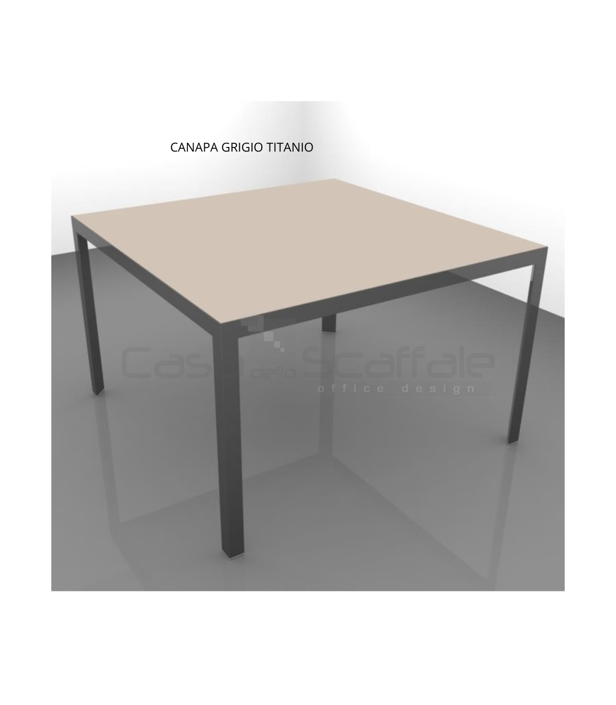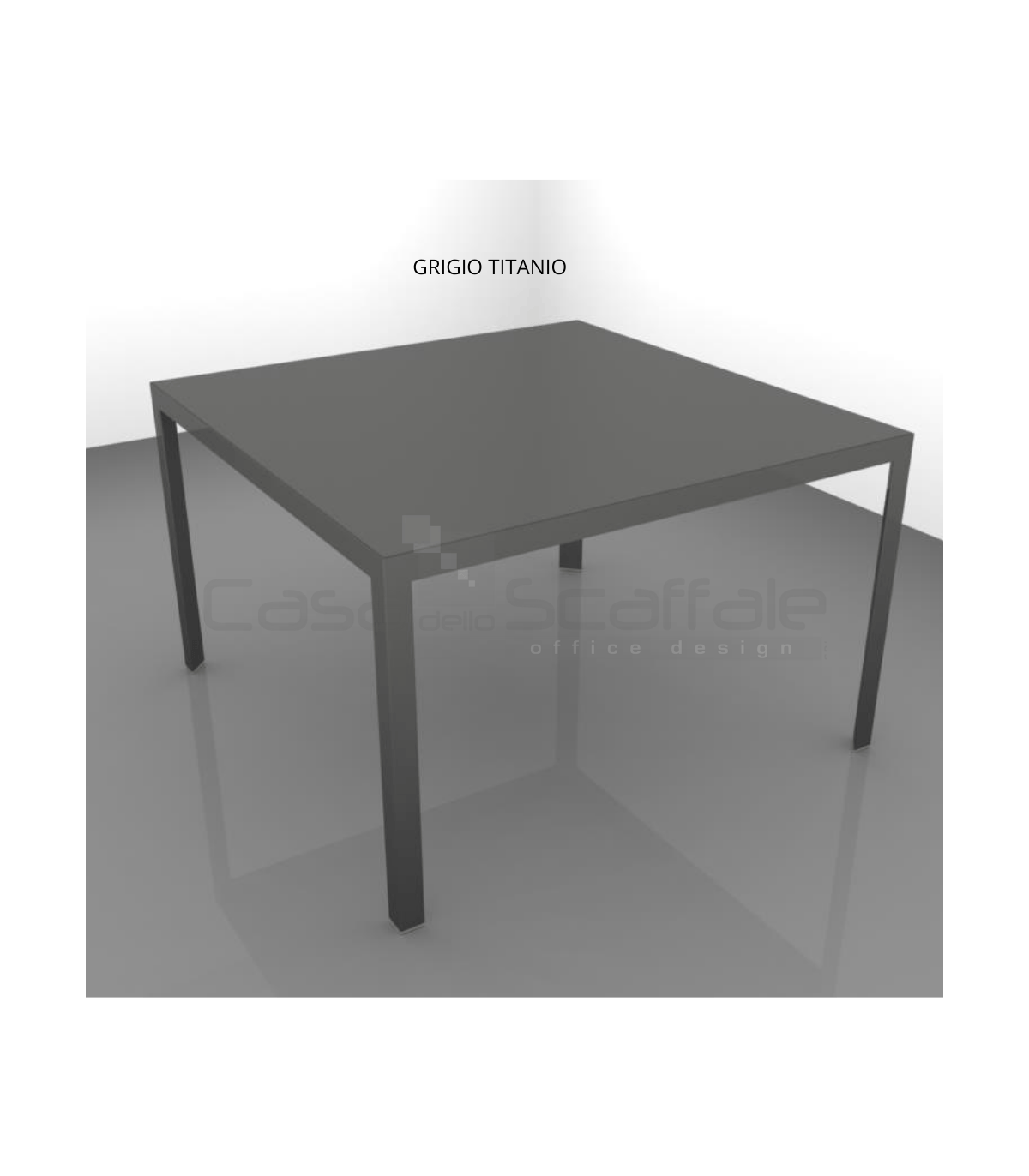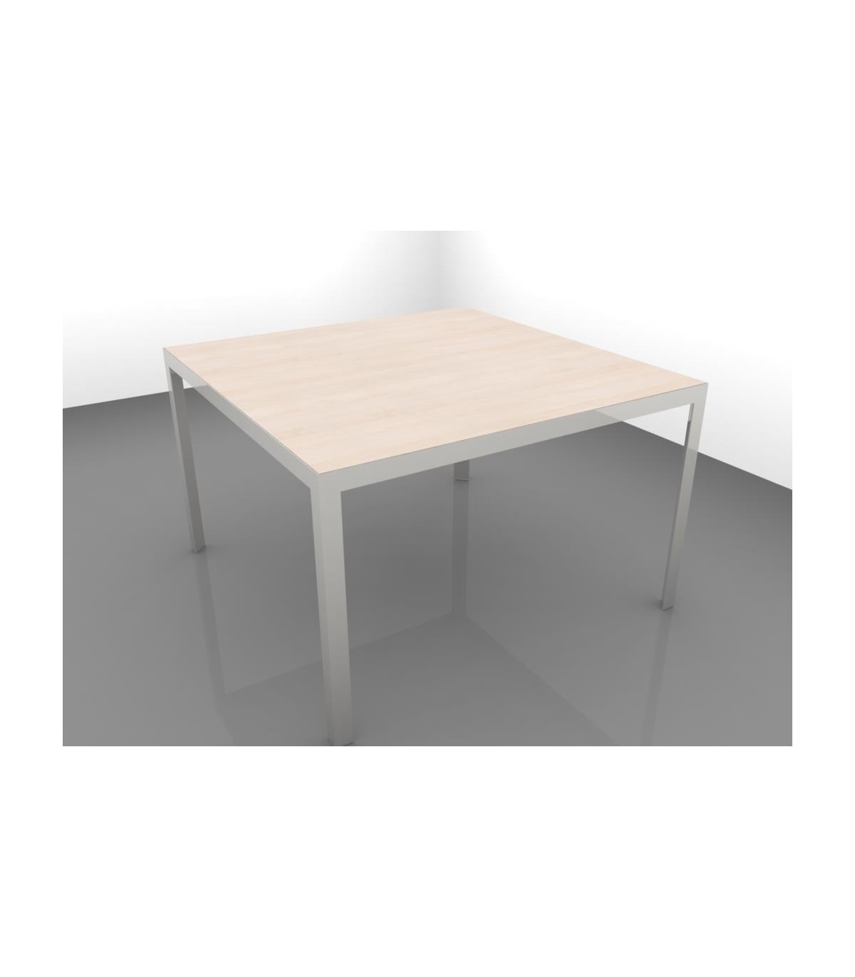Struttura realizzata con profili in estruso di alluminio, sezione 50 x 45 mm spessore 3 mm e sostegni in acciaio a sezione triangolare. La struttura è verniciata con polveri epossidiche e riceve ad incasso il piano di lavoro.